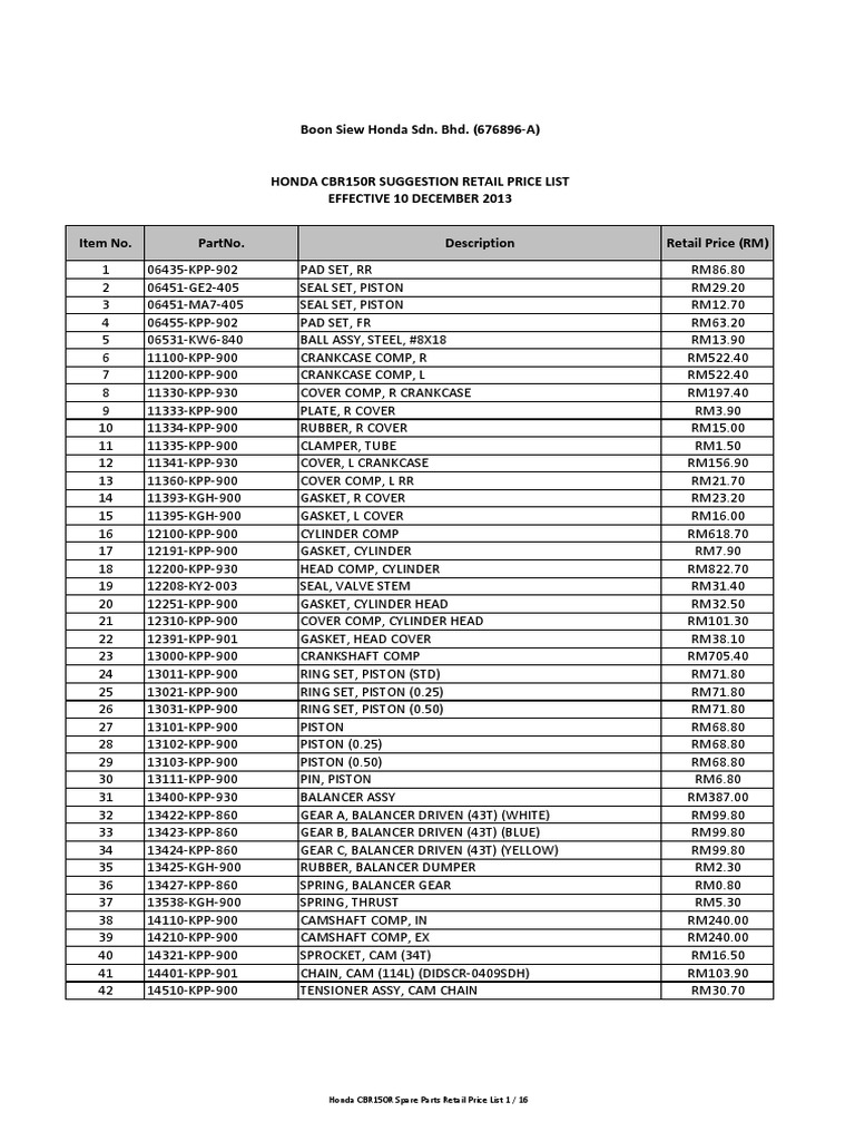 Cbr150r Suggestion Retail Price List 2013 V2 Pdf Engines Internal Combustion Engine