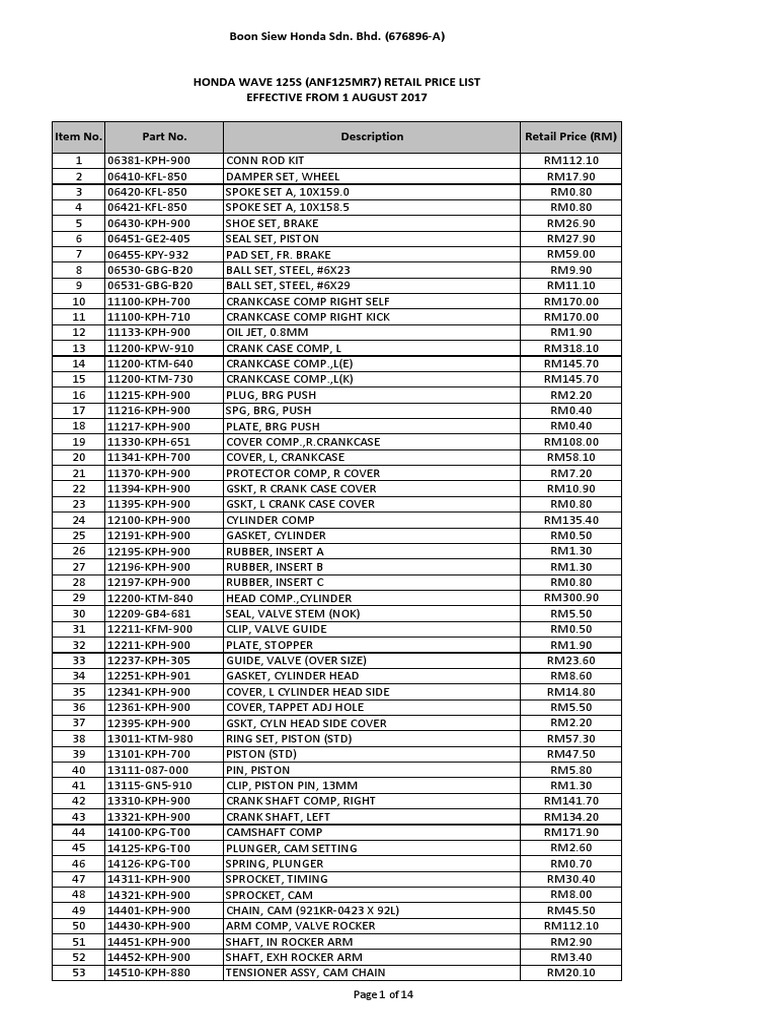 Wave125s Anf125mr7 Suggestionretailpricelist Aug2017 Pdf Carburetor Clutch